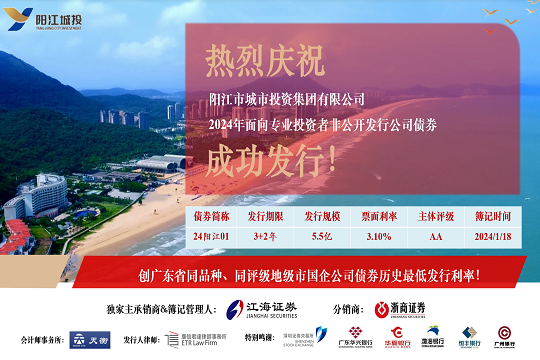 2024年1月19日,市城投集團在深圳證券交易所成功發(fā)行“陽江市城市投資集團有限公司2024年面向?qū)I(yè)投資者非公開發(fā)行公司債券”。本期債券發(fā)行規(guī)模為5.5億元,期限為5(3+2)年,票面利率3.10%,全場認購倍數(shù)超過4.8倍,是...